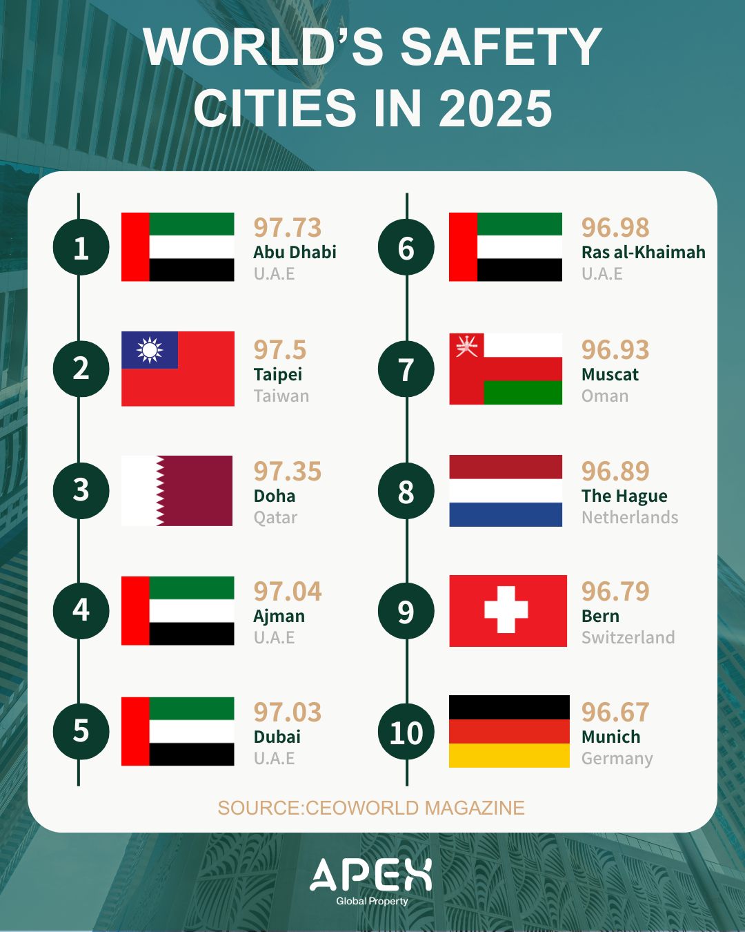 根據《CEOWORLD Magazine》2025年全球安全城市排名,全球前十名裡,阿聯酋就佔了四個席次!其中阿布達比更是以 97.73 分 高居全球第一!而台北位在第二名,若你覺得在台灣生活得很安心,在阿聯酋你也可以生活得很安心!
