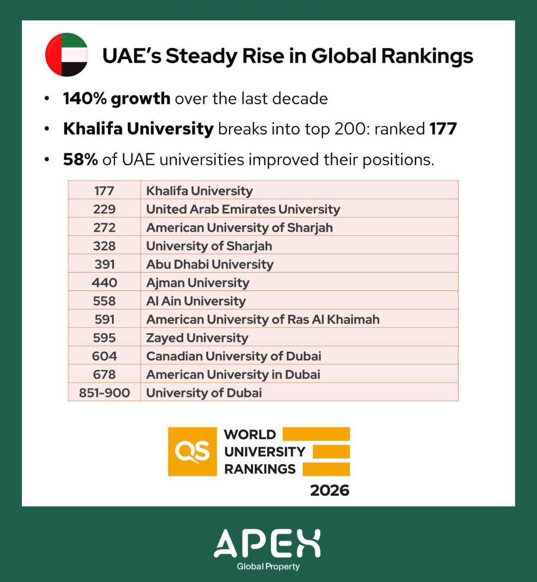 According to the latest “2026 QS World University Rankings,” 12 UAE universities are listed (up from only 7 last year), with 7 of them improving their ranking from last year, indicating a rapid advancement in their educational standards.