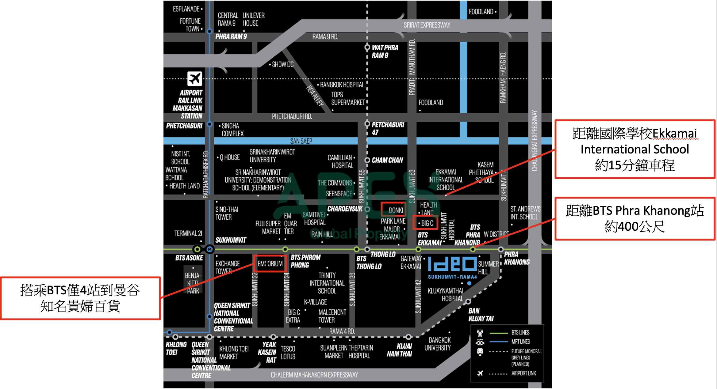- 生活機能健全:鄰近曼谷兩大超市 Lotus 及 Big C,國際學校、國際醫院、露天市集、生鮮市場鄰立,生活機能建全深受上班族和國際人士歡迎。