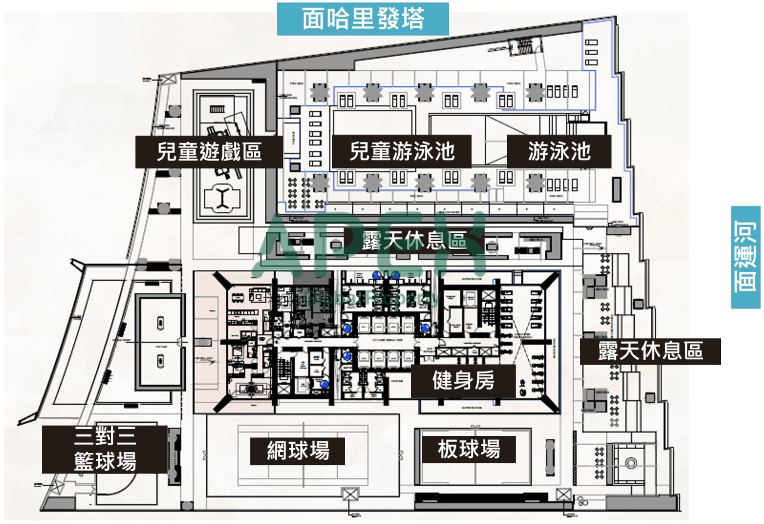 SPA三對三籃球場健身房兒童遊戲區冥想室多功能使用空間戶外泳池板球場網球場
